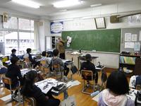 理科室では5年生が、理科「物のとけ方」の学習をしていました。透明に見える水溶液から、溶けている個体を取り出す学習に夢中になっていました。写真は、「透明なのに溶けているものがあるの?」などといった、みんなの問いを実験で確かめていく方法を確認している場面です。