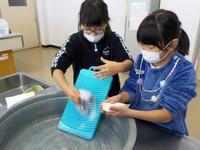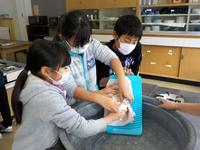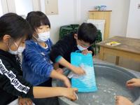 さてこの日、3年生は、昔の道具である「洗濯板」を使って、洗濯を体験する学習を行いました。まず、洗濯板というものがあることにびっくりした子どもたち。板に溝に衣類をこすりながら洗濯することは初体験ながらも、先生に教えてもらったアドバイスをもとに、活動を楽しんでいました。