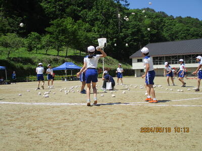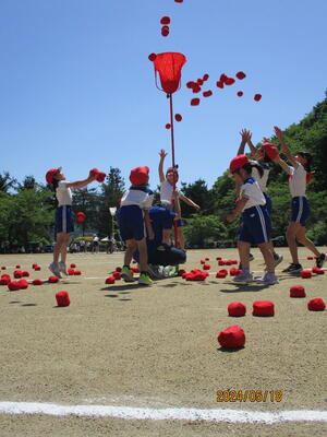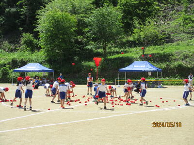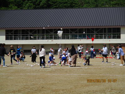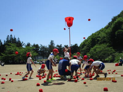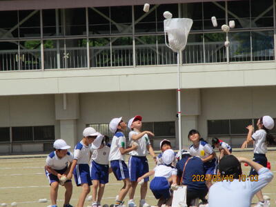 2024年5月18日 14時27分紅白玉入れでは、1回目は子どもで行い、2回目は保護者参加で行いました。なかなか入れるのは難しかったようですが、一つでも多く入れようとねらいをさだめていました。