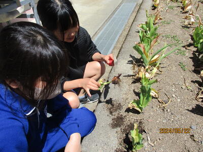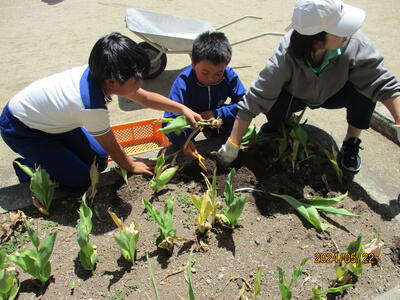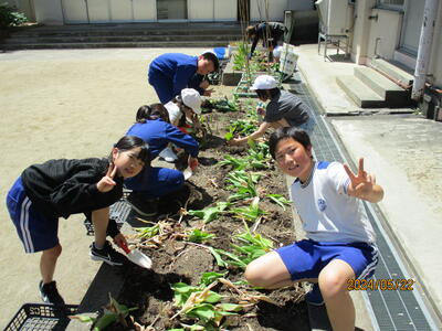 2024年5月22日 14時56分体育環境委員会が、花壇の整備を行いました。昨年度の秋に植えたチューリップが4月にきれいに咲き、咲き終わったので球根を取り、来年度に備えます。手際よく作業を進めました。