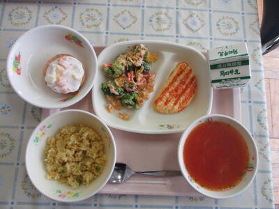 2024年2月22日 12時42分2月22日の給食は、楢原小6年生のリクエスト献立です!メニューは「カレーピラフ、オムレツ、コーンフレークサラダ、ミネストローネ、フルーツヨーグルト」です。食育の学習で考えた献立です。様々な食材がバランスよく入っていて、とても豪華な給食になりました。