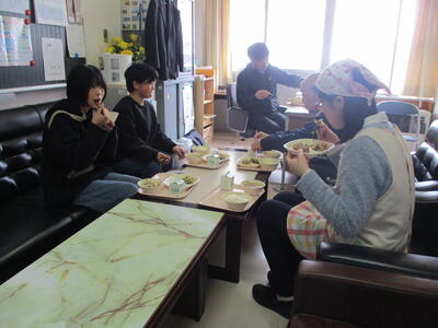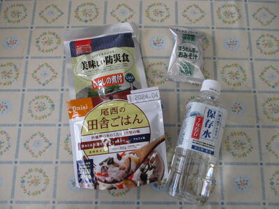 2024年2月28日 08時59分町から非常用保存食をいただきました。いわしの煮付け、ほうれん草のみそ汁、田舎ご飯、保存水です。これは有事に備えて町で備蓄しているものです。試食を通して、非常食について理解を深めていただくことを目的としています。児童1人に対して1セットずつ配付します。ご家族でぜひ試食してみてください。