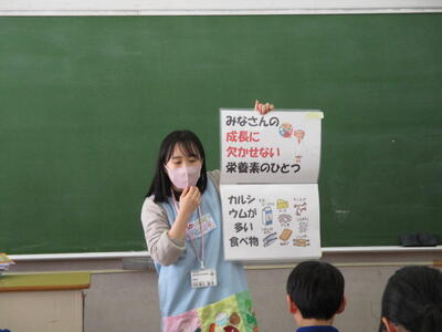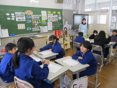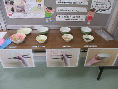 2024年1月26日 16時17分栄養技師の皆川先生に来ていただき、食育の授業を行いました。おやつには、楽しみの時間や小腹を満たしてくれるという効果がある一方で、摂りすぎしてしまうと体の健康を損なうこともあり、時間・種類・量に気を付けて食べることが大切であることを学びました。おかしに含まれている砂糖や油が一目でわかる模型もたくさん準備して下さいました。その他、牛乳についてのお話やはしの使い方コーナーまで作ってくださいました。