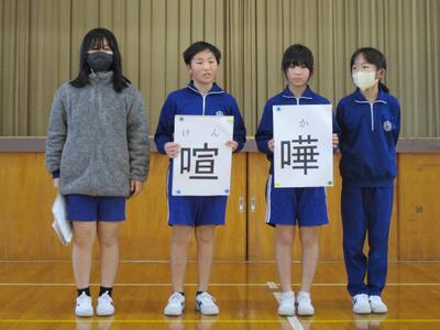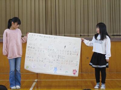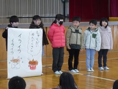 2024年1月31日 14時32分今日は、5年生企画の「節分集会」がありました。学年ごとに、心の中から「追い出したい鬼」を発表しました。「宿題めんどくさい鬼」「好き嫌い鬼」「話を聞かない鬼」「けんか鬼」「優柔不断鬼」など、様々な鬼が出ました。悪い鬼を追い出せるよう頑張ります!