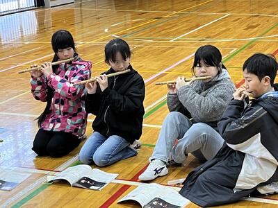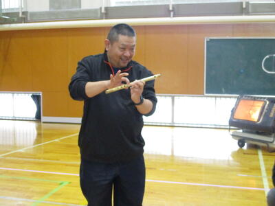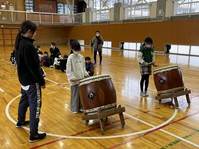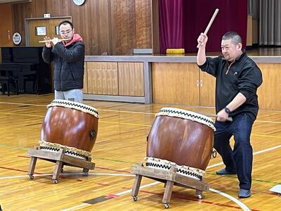 2024年2月21日 14時25分2月20日に、4・5年生が和太鼓、しの笛を体験しました。大川渓流太鼓の岩澤修さんと渡部幸汰さんをお招きし、「下郷甚句」の太鼓の打ち方やしの笛の音の出し方を教えていただきました。リズムや旋律に親しみながらも、本物の迫力ある演奏を生で味わうことができました。