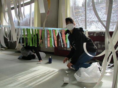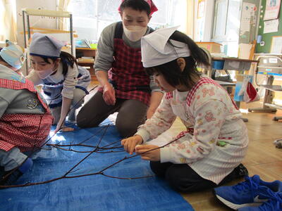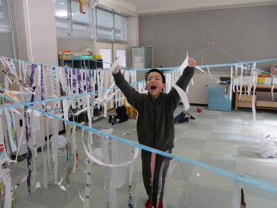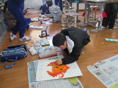 2024年1月12日 12時42分2年生は、図画工作科「つないでつるして」の単元で、教室中にたくさんのひもをつないで、みんなで大きな作品を作りました。3・4年生の体育科は、なわとび学習です。ペアで跳んだ数をカウントし合い、なわとびコンテストに向けて頑張っていました。5・6年生の図工は、「防火ポスター(5年)」、「未来のわたし(6年)」の単元です。楽しみながら想像力豊かに制作していました。