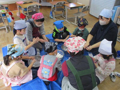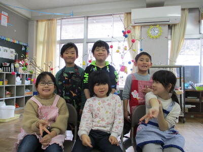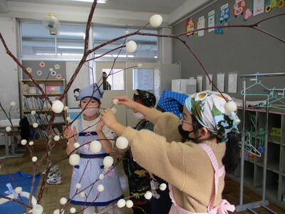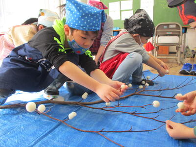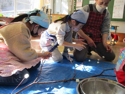 2024年1月12日 16時24分小正月にだんごさしをしました。みんなで「楢原小学校のみんなが幸せになるように」「元気にすごせますように」と願いを込めて作りました。だんごのもちっとしたり、ねばねばしたりの感触を楽しみながら作りました。