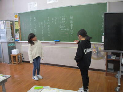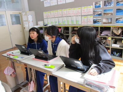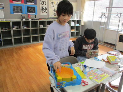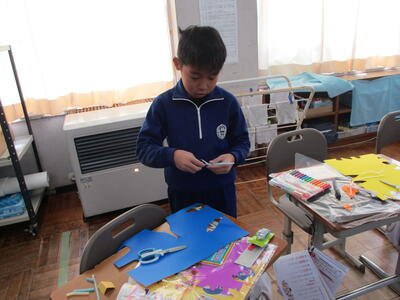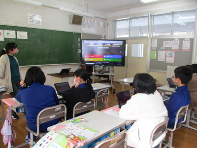 2024年1月18日 12時54分2年生は、図画工作科「パタパタストロー」の学習で、色画用紙で人や生き物を作り、ストローに貼り付け、楽しそうに制作していました。6年生の外国語科は、オンラインでのクイズアプリを使って、既習事項の復習をしていました。グループで相談しながら解答し、楽しみながら学んでいました。