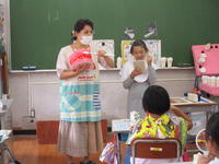 3年生は、自分の歯並びや特徴を、鏡を使って確認しました。また、実際にお菓子を食べて、おやつとむし歯の関係も学習しました。ブクブクうがいは、口の中の食べかすは取れるけれど、歯についたバイキンは、歯ブラシを使ってみがかないと取れないことを教えてもらいました。そして歯の染め出しを行い、みがけていないところを確認し、正しいブラッシングの仕方を学習しました。おやつを食べた後の口の中には、食べかすがいっぱいあって、それが口の中のバイキンの栄養になると聞いて、今まで以上にしっかりと歯みがきをする3年生でした。