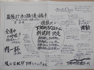 先生方から寄せ書きをいただきました。生徒には昨日の練習で渡していただいたそうです。頑張れ下中生!
