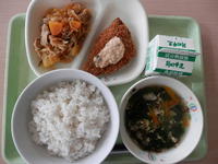 今日の給食は、「ご飯、豆腐ハンバーグ、ひじきのきんぴら、エノキの味噌汁、牛乳」でした。ふわふわした食感のハンバーグは和風ミートローフと言って良いと思いました。とてもおいしかったです。ごちそうさまでした。