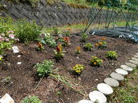 学校花壇に花苗が植えられました。花壇の一部は「畑」として管理されます。畑に「キュウリ・トマト」など夏野菜の苗が定植されました。収穫の時期が楽しみです。