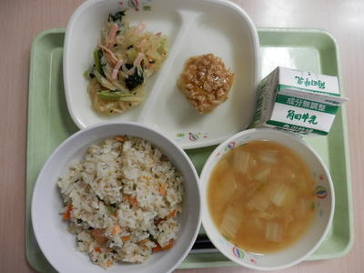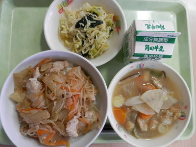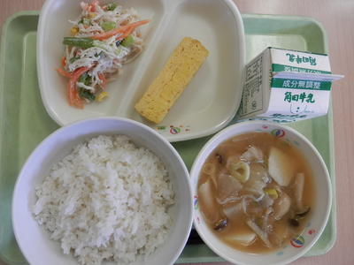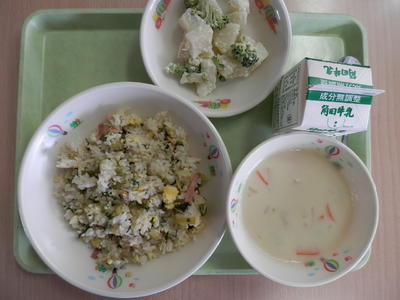 今日の給食は「中華丼、中華サラダ、ニラのスープ、牛乳、牛乳ゼリー」でした。ボリュームもあり食べ応え満点でした。窓の外を見ると雪が降っている寒い日でしたので、温かい今日の給食はおいしさがアップしていました。給食センターの職員の皆さん!いつも美味しい給食ありがとうございます。(校長)