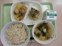 今日の給食は「ご飯、豆腐の味噌焼き、道産子汁、磯和え、ミカン、牛乳」総熱量745㎉、タンパク質30.0g、脂質13.9g、カルシウム433mg、塩分2.5gでした。「道産子とは北海道生まれの人や馬のことを言うほか、北海道の食材を使った料理にも使います。寒い日には体を温めてくれる料理です。」とコメントがありました。