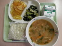 今日の給食は「味噌ラーメン、こまつナムル、おさつチップス、牛乳」総エネルギー858㎉、タンパク質33.0g、脂質22.5g、カルシウム436mg、塩分5.gでした。一口メモには「さば節でとった中華だしで煮込んだ野菜たっぷりの味噌ラーメンです…」とありました。今日も美味しくいただきました。(校長)#下郷中学校#連休中の部活動報告#今日の給食