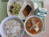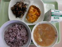 今日の給食は「紫黒ご飯、鮭のもみじ焼き、ひじきの炒め煮、具だくさん味噌汁、牛乳」総エネルギー760㎉、タンパク質35.5g、脂質24.6g、カルシウム405mg、塩分2.7gでした。一口メモには「今日は、郷土食を考える日なので、下郷町産の紫黒米を使いました。紫黒米にはビタミンB群やカルシウム、マグ根史オウムなども含まれ、紫色の元になるアントシアニンも入っています。アントシアニンには目の疲れをとったり、血液をきれいにする働きがあります」とありました。鮭のもみじ焼きは、ニンジンとマヨネーズを合わせて塩こしょうで味を調えてありました。鮭、もみじと聞くと秋を感じます。美味しかったのでレシピについては、下郷町共同調理場までお問い合わせください。(校長)#下郷中学校#11月の行事#加筆しました#今日の給食