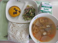 今日の給食のメニューは「きのこうどん、磯和え、カボチャの蒸しパン、牛乳」エネルギー:866㎉、タンパク質:40.2g、脂質:18.7g、カルシウム:447㎎、塩分:4.8gでした。一口メモには「きのこには、カルシウムの吸収を助けるビタミンDやおなかの調子を整える食物繊維などが含まれています。また、うまみ成分が多く含まれているので、料理を美味しくしてくれます」とありました。