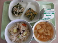 今日のメニューは「秋色ご飯、千草焼き、切り干し大根のはりはり漬け、ジャガイモと油揚げの味噌汁、牛乳」エネルギー:753㎉、タンパク質:28.4g、脂質:19.4g、カルシウム:415㎎、塩分量:3.5gでした。