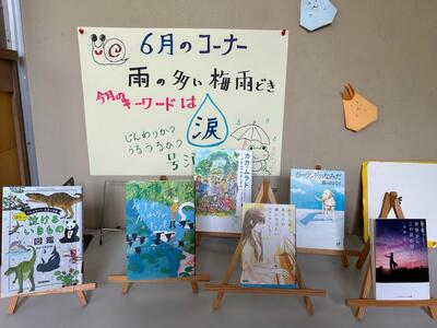 図書室の前に6月コーナーがあります!そこには「雨の多い梅雨どき」キーワードは「涙」という見出しが書かれており、目をひかれました!お勧めの本が何冊か並べてあり私も読んでみたくなりました。朝の読書や休み時間の様子を見ても、それぞれの学級で読書を している人がいますし、図書室にも多くの人が訪れています。梅雨どきに素敵な本と出会い、それぞれの感じ方で、「本の魅力」を味わってほしいと思います。