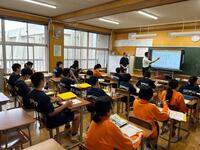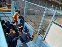 今日は天気も良く入道雲らしき雲が出ていました。夏ももうすぐです。1年生がプール清掃に取り組んでいました。
