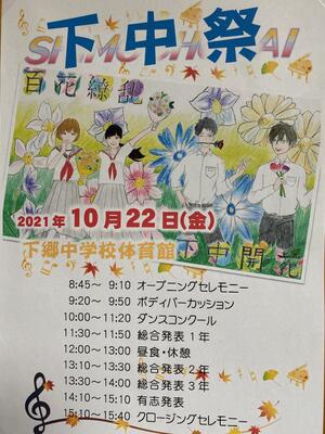 2021年10月20日 14時51分下中祭のポスターを紹介します。このポスターは、3年生の五十嵐珠璃さんが作成しました。「百花繚乱」という言葉のように、それぞれの個性が輝き、みんなが笑顔になれる下中祭になって欲しいという願いが込められているそうです。