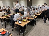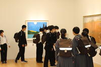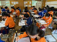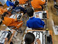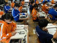 2021年10月13日 10時20分先週に引き続き、1年生の書写の授業で白石光史先生にご指導いただきました。白石先生からは、前回よりも筆がスムーズに動いている等の感想をいただき、生徒は集中して「月光」という字を書き上げていました。