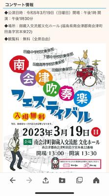 2023年3月17日 12時12分3月19日(日)に南会津吹奏楽フェスティバルが3年ぶりに開催されます。この演奏会は、日頃の練習の成果を地域の皆様へ発表する機会として開催しています。本校吹奏楽部と田島中・田島高校・田島吹奏楽団が出演します。ぜひ、ご来場いただければと思います!