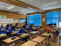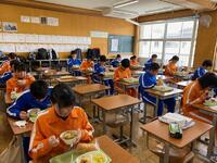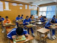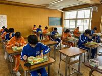 2022年3月16日 13時05分3年生が卒業し、何となく寂しさを感じますが、1・2年生は元気に生活しています。今日の給食は、コッペパン、リンゴジャム、キノコソースオムレツ、コーンサラダ、野菜スープ、牛乳でした。おいしそうに食べていました!
